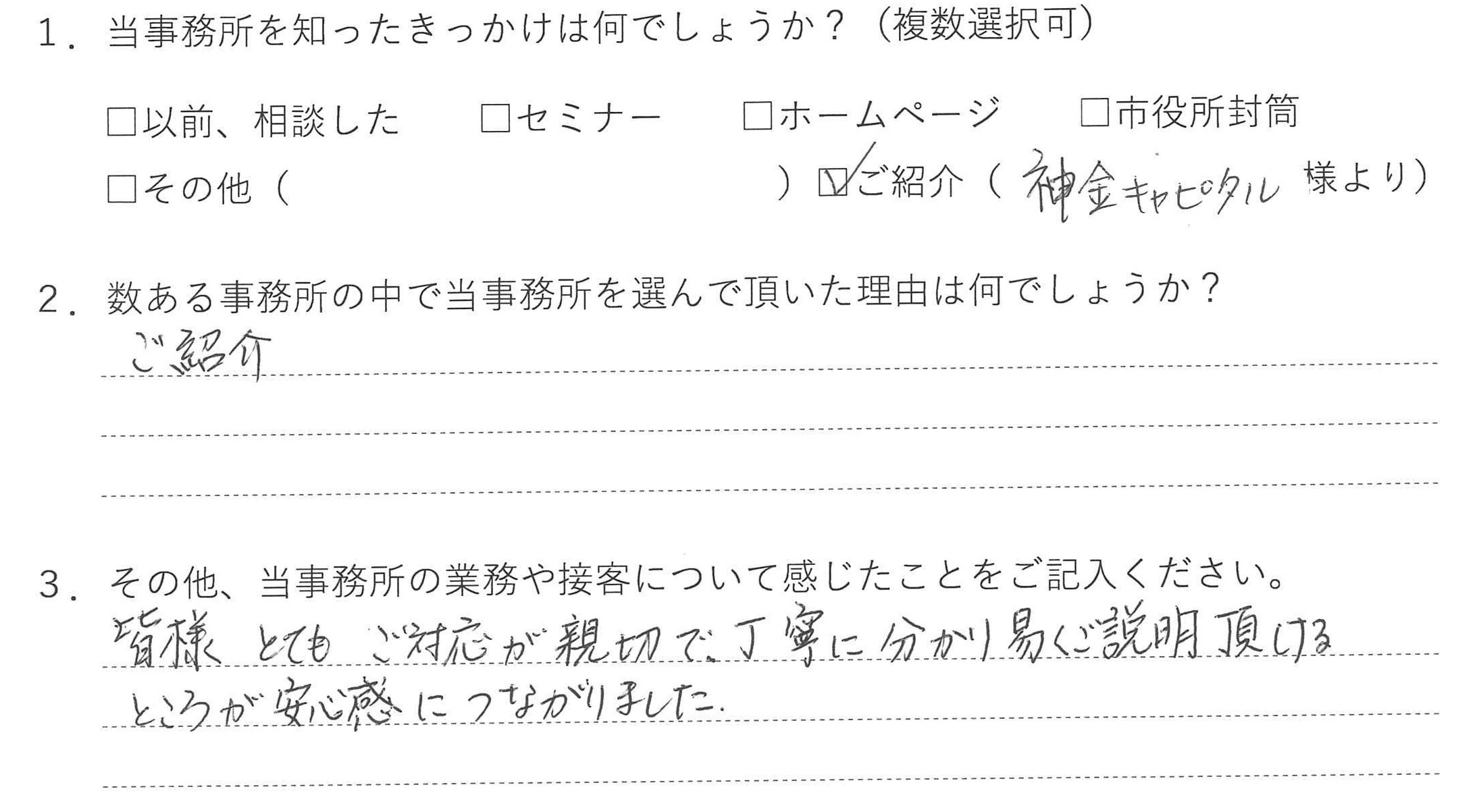 【相続登記】加古川市 K様 当事務所を知ったきっかけは何でしょうか? ホームページを見た 数ある事務所の中で、当事務所を選んで頂いた理由は何でしょうか? 実績があり信頼出来る事務所だと感じたため。 お仕事させて頂く中で、当事務所の業務や接客について感じたことをご記入ください。 説明も丁寧で、スムーズに手続きをして頂きました。