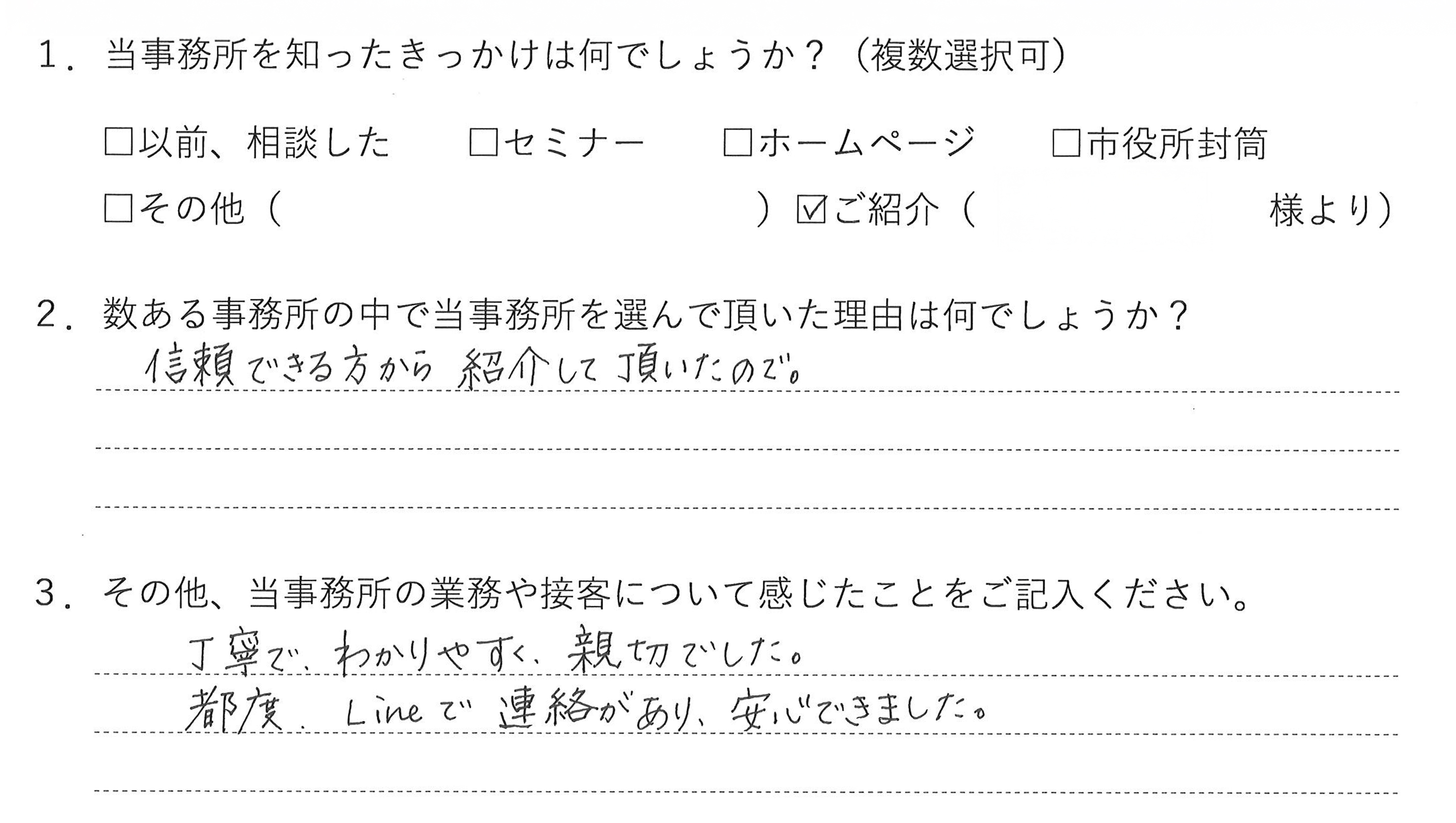 税金関係で長年お付き合いのある事務所様からの紹介で決めました。