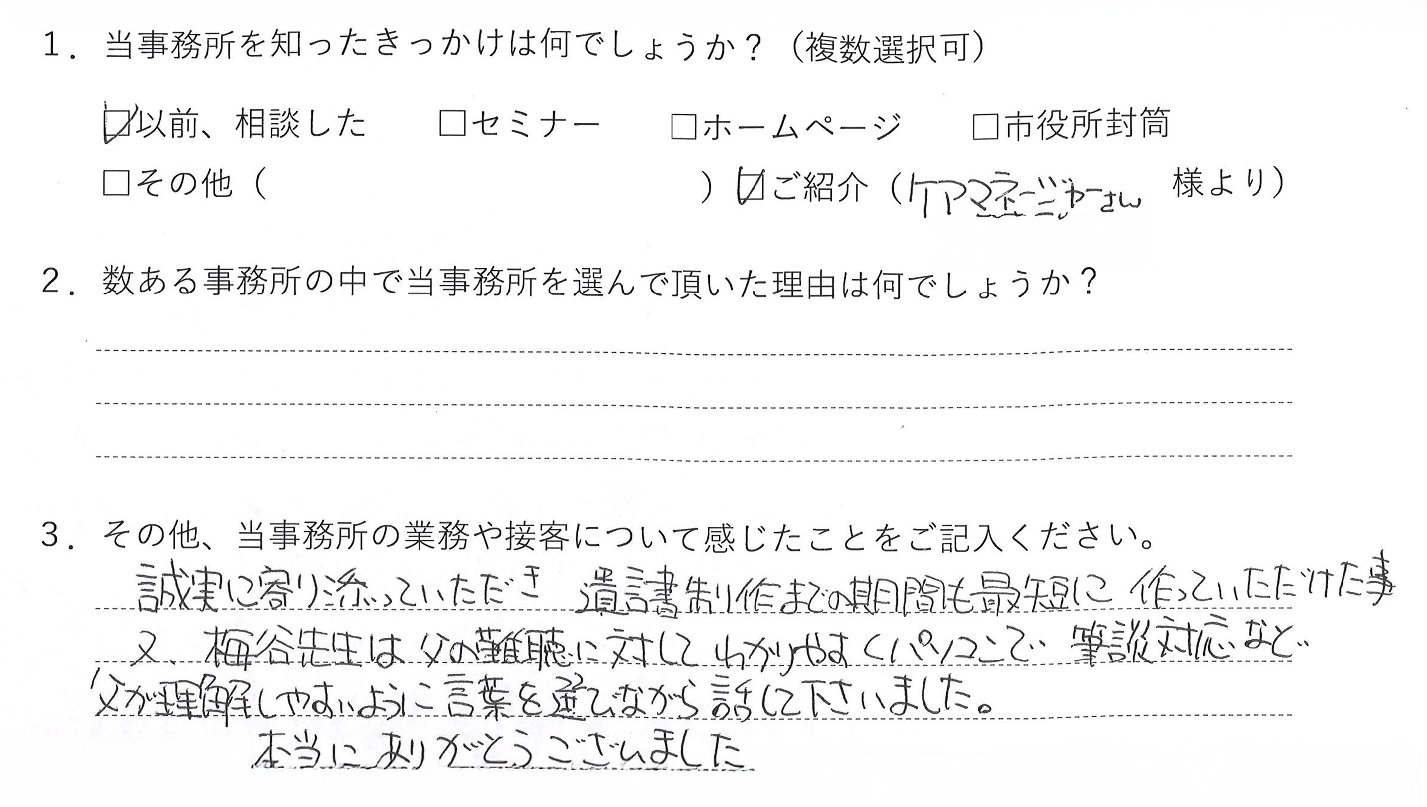 不動産の登記や相続について丁寧に説明していただき遺産分割協議書作成をスムーズに進めていただきました。スタッフの方々の対応は親切・丁寧でしたので安心して相談出来ました。
